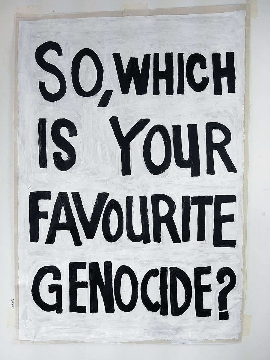 The project incorporates a wide range of materials, from ephemeral supports such as newsprint, paper, and masking tape to oil on canvas, bringing together impermanence and durability. Self-portraits appear throughout the series, introducing a direct and personal presence that acknowledges vulnerability while resisting fixed ideological positions. The work avoids alignment with specific political movements, instead creating space for reflection, ambiguity, and dialogue.